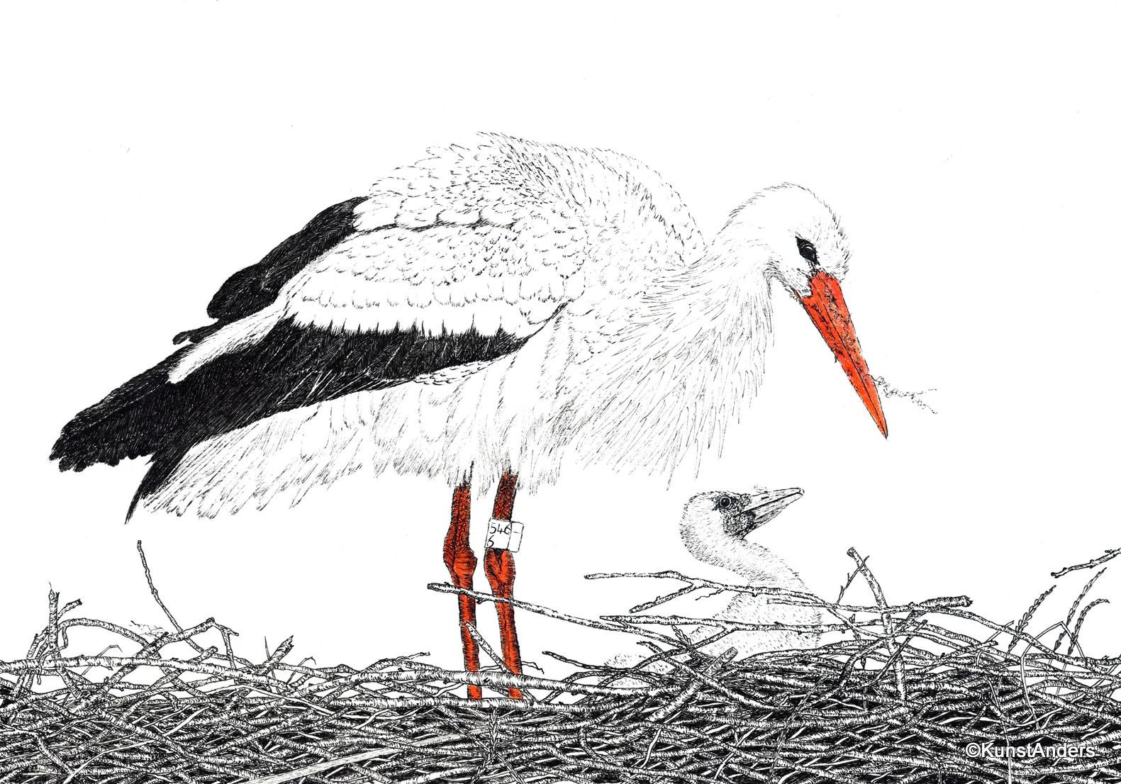 Pentekening en sneak preview Ooievaar (Ciconia ciconia L., oorspr. Ardea ciconia)