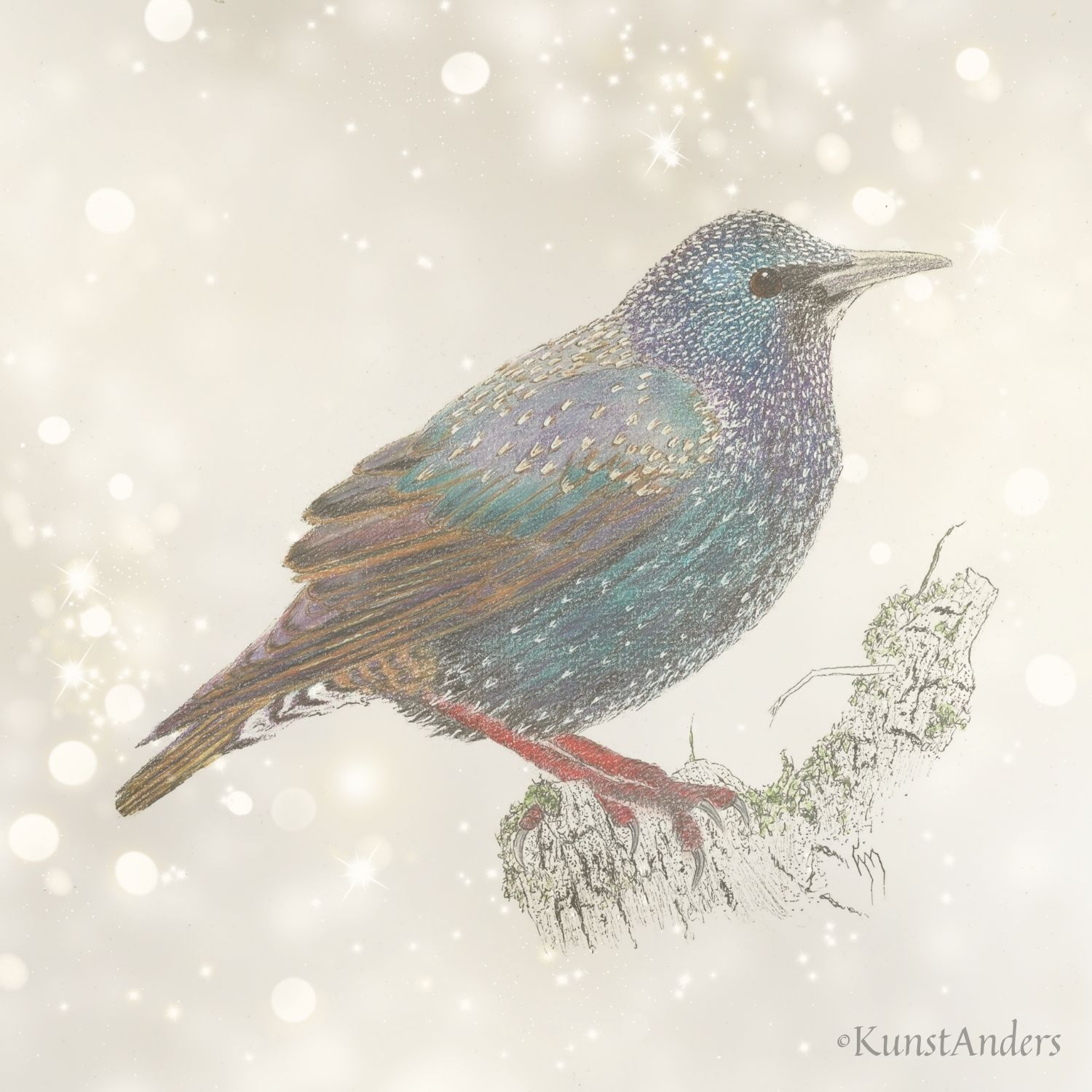 De tekening toont een spreeuw in winterkleed